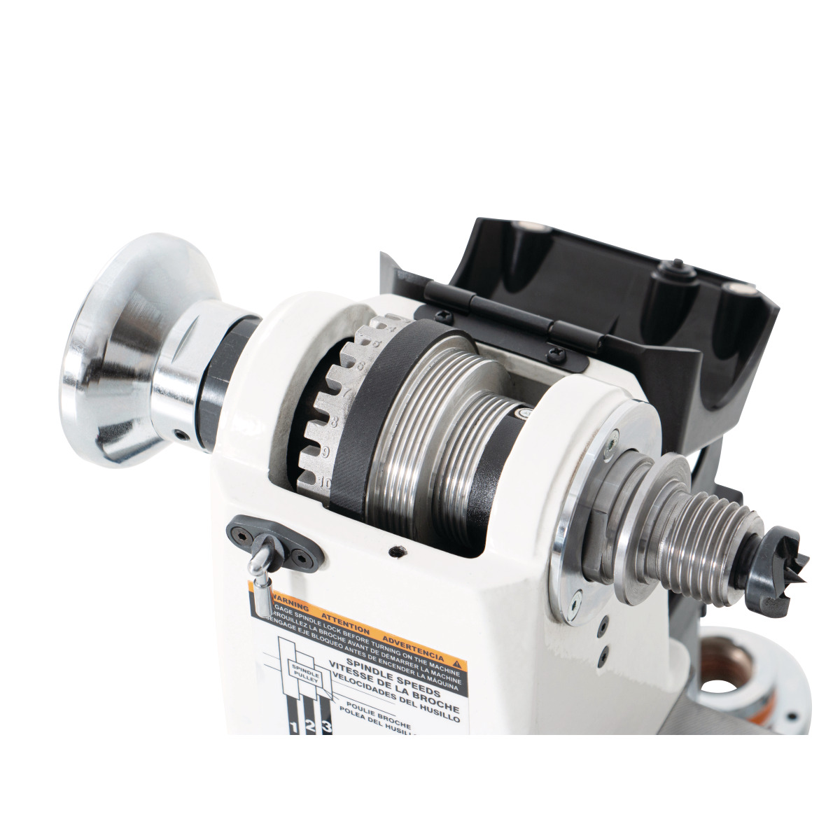 - Praktyczne 24-pozycyjne ustawienie wrzeciona umożliwia precyzyjne pozycjonowanie, np. pod wiercenie oraz bezpieczne zablokowanie